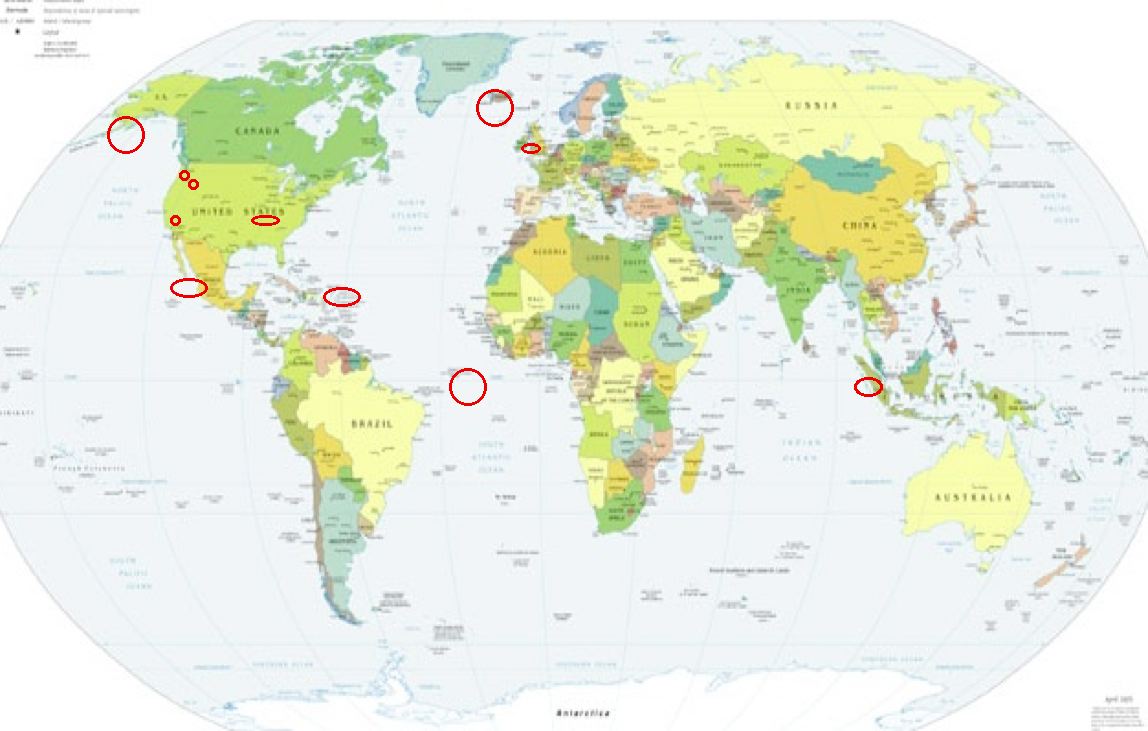 LEGEND for OVERVIEW: Size = My surety of area for quake.